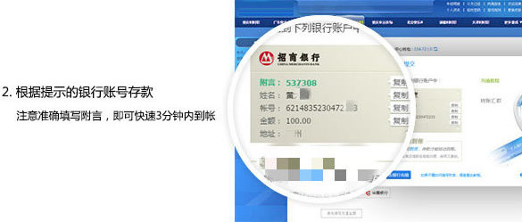 注意:在转账的时候一定要填写正确的附言,填写正确后您的款项将在1分钟内到账,否则将无法到账。