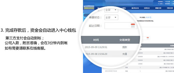 请将您的具体存款姓名,存款金额,存款时间,存款银行通过 在线客服 联系我们,并在1~3分钟内刷新中心钱包;